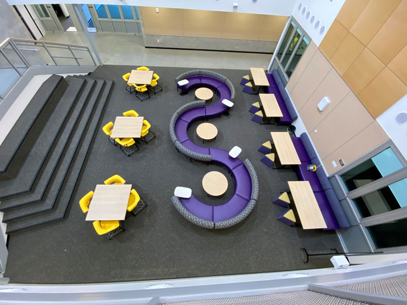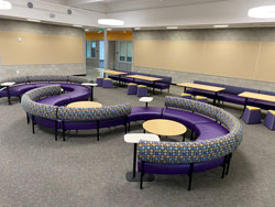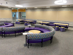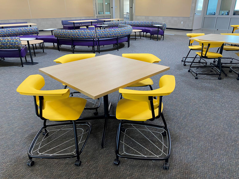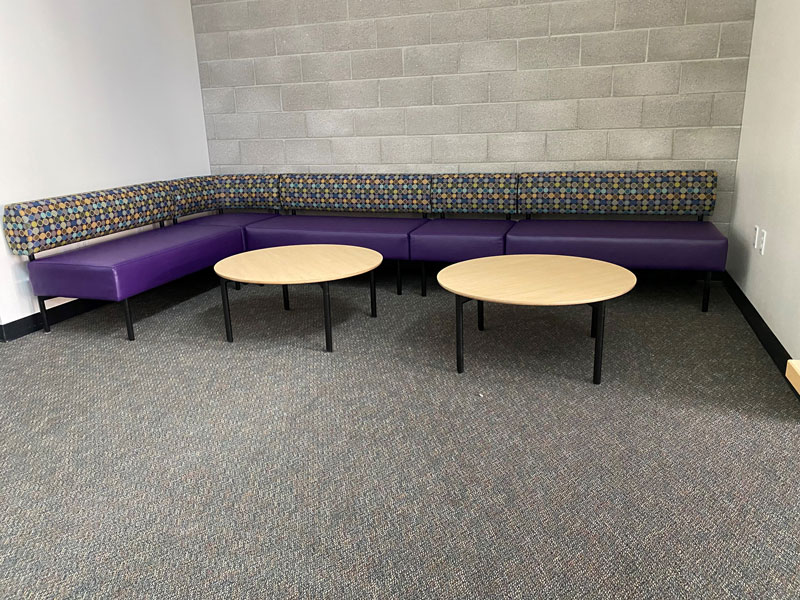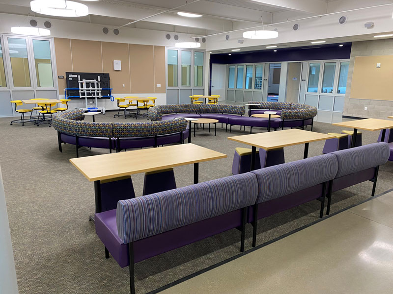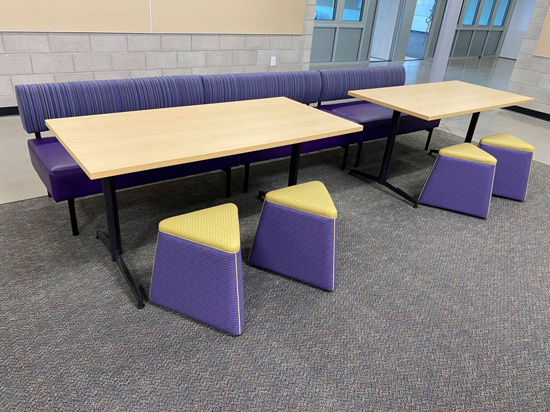 When given a design intent for a collaboration space that not only attracts but engages students to be present and learn, we intentionally specify products and bleach cleanable fabrics for their longevity and durable characteristics. Keeping the school spirit in mind, we select colorways of fabrics and poly seating to align with the school colors. These collaboration spaces required students to use technology anywhere, but also have the option as to where they want to collaborate.
