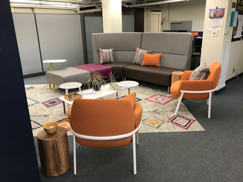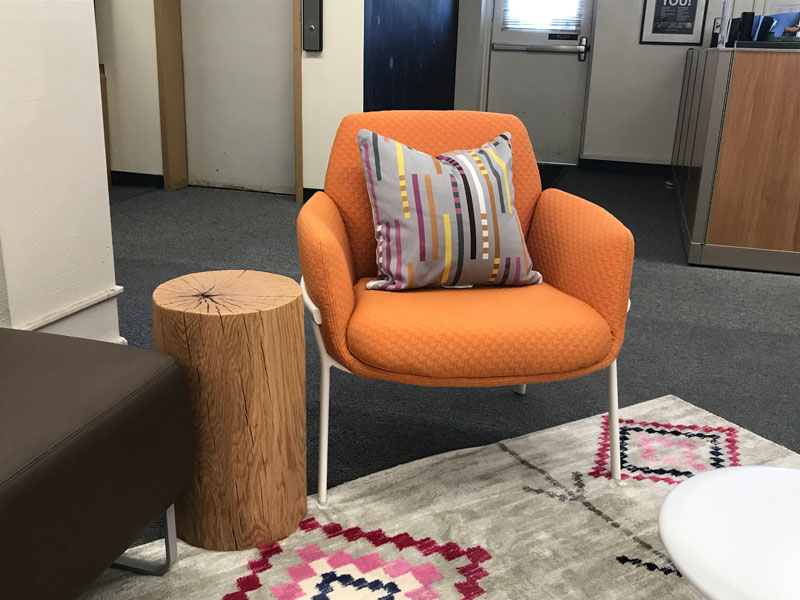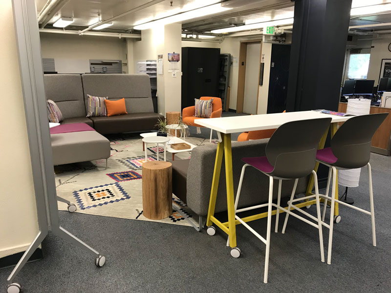 Something was definitely missing in this space, meant to counsel and encourage college students. We were able to bring some life to this dreary basement with a central collaborative area that includes fun pops of color, mobile tables for flexibility and natural elements through solid wood end tables. The color blocked sofa has the dual purpose of providing comfortable seating, and division from the adjacent work space with the use of a high back option. A rug helps to ground the space and further inspire the fun color pallete that bucks the traditional UNR blue and grey.